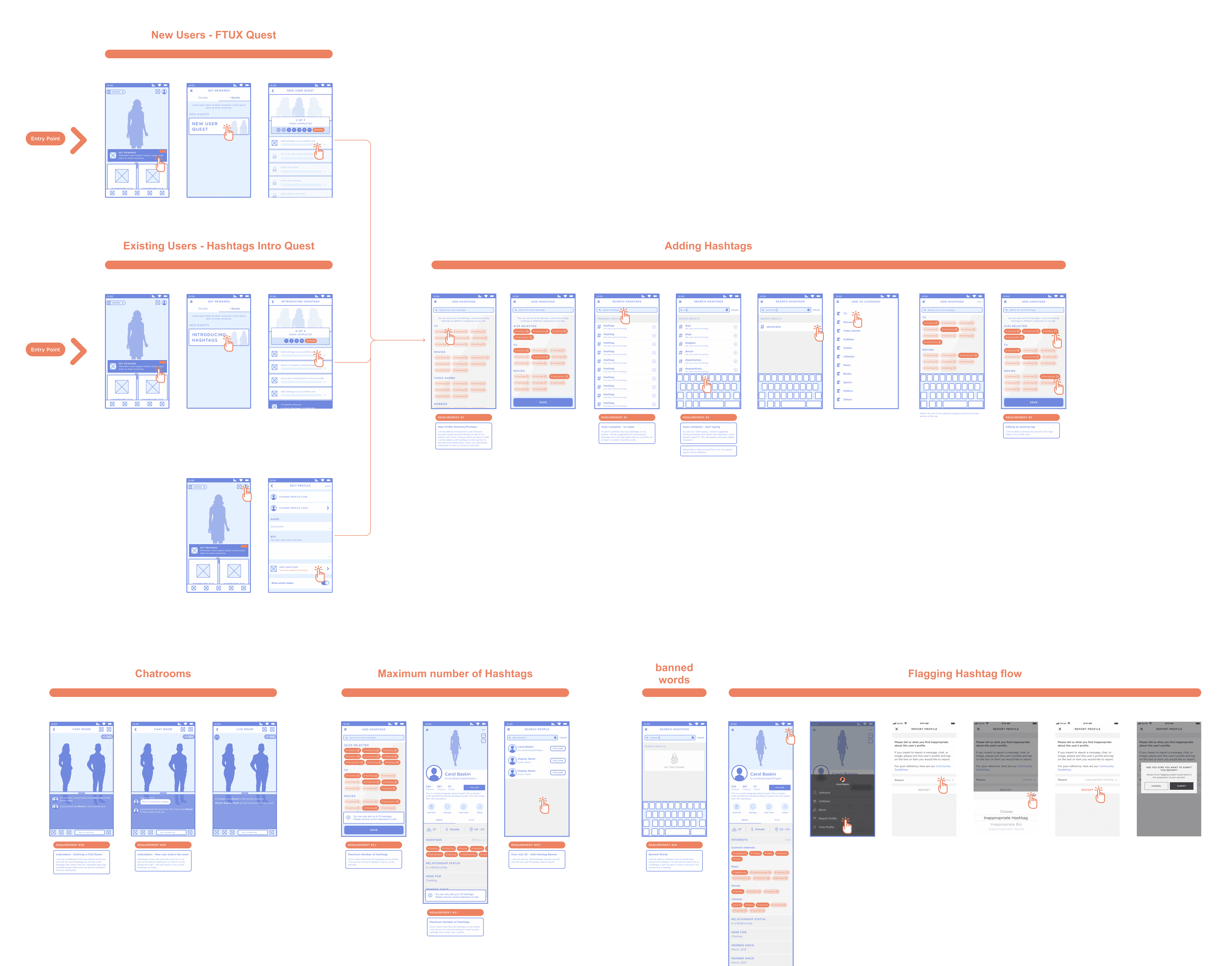 The feature touched search, profile editing, FTUX, quests, chat rooms, and campaigns—leading to hidden scope. I later presented recommendations to leadership on how to better scale project scope to team capacity while maintaining impact.